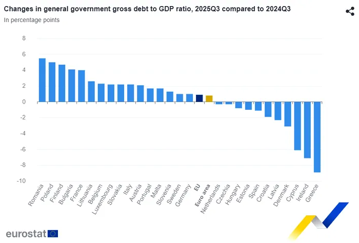 Mai mult, Eurostat arată că România a avut cea mai mare creștere a datoriei guvernamentale în PIB în trimestrul 3 2025 față de același trimestru din anul anterior.