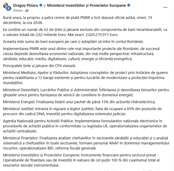„Bună seara, la propriu: a patra cerere de plată PNRR a fost depusă oficial astăzi, vineri, 19 decembrie, la ora 20:06. Ea conține un număr de 62 de ținte și jaloane exclusiv din componenta de bani nerambursabili, cu o valoare totală de 2,62 miliarde Euro. Mai exact: 2.620.279.973 Euro. Aceasta este suma de bani europeni pe care o așteptăm să intre în contul României. Implementarea PNRR este unul dintre cele mai importante proiecte ale României, de succesul căruia depinde dezvoltarea economiei naționale, din mai multe perspective: infrastructură, sănătate, educație, mediu, digitalizare, cultură, energie și eficiență energetică”, a scris Dragoș Pîslaru pe Facebook.