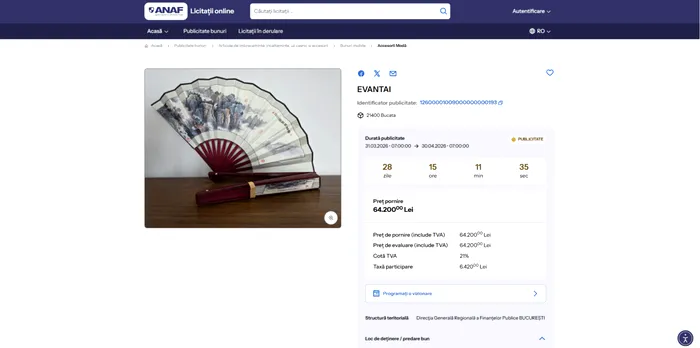 Agenția Națională de Administrare Fiscală, împreună cu Minsterul Finanțelor, au lansat platforma digitală „eLicitațiiANAF”, unde sunt listate mașini, bijuterii scumpe, ceasuri de lux, apartamente și alte active confiscate sau asupra căora s-a pus sechestru. Printre acestea, Fiscul a postat și un lot de evantaie care, pentru antreprenorii atenți la oportunități, ar putea fi o idee de business profitabil.