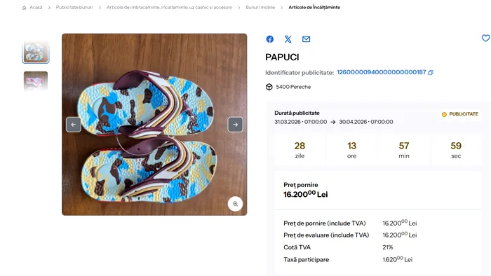 Pe lângă evantaie, Fiscul a pus la licitație și un lot de 5.400 de perechi papuci, cu o valoare de 16.200 de lei. La fel ca în cazul evantaielor, prețul per unitate este de doar 3 lei. Astfel, dacă fiecare pereche de papuci ar fi vândută cu 10 lei, valoarea lotului ar ajunge la 54.000 de lei, iar după scăderea costului de achiziție de 16.200 de lei, profitul brut ar fi de 37.800 de lei.