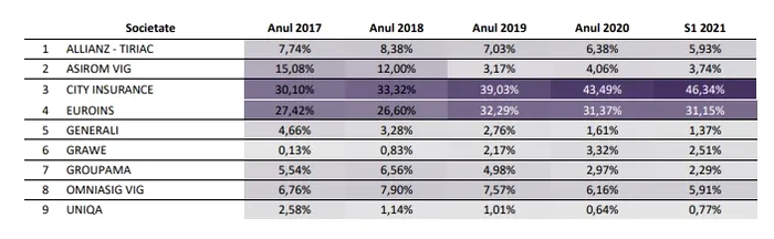 La acea dată, gradul de concentrare se menținea ridicat pentru primii asigurători din top la finalul primului semestru al anului 2021, astfel că primii doi asigurători cumulau aproximativ 77,5% din portofoliul de asigurări RCA din România. Pe primul loc era City Insurance, cu 46,43% cotă de piață, urmată de Euroins, cu 31,15%. Uniqua se afla pe locul 9, cu 0,77% din piață. Conform graficelor ASF, prezența în piață se diminuase față de anul 2017 când avea 2,58%.
