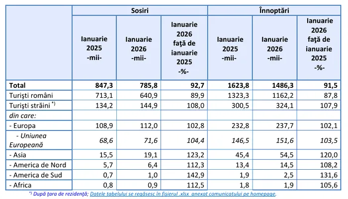 Sosirile înregistrate în structurile de primire turistică în prima lună a anului au însumat 785.800 persoane, din care cele ale turiștilor români au reprezentat 81,6%, iar sosirile turiștilor străini 18,4%. De asemenea, înnoptările înregistrate în structurile de primire turistică în ianuarie 2026 au însumat 1,486 milioane, în scădere cu 8,5% față de cele din luna ianuarie 2025.