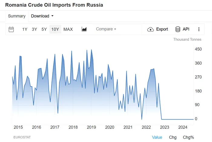 Captură foto: tradingeconomics.com / Cantitatea de țiței importată de România din Rusia (2015 -2024)