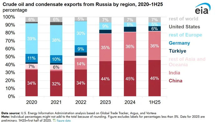 Europa a primit 51% din exporturile de țiței și condensat ale Rusiei în 2020. Cu toate acestea, acest volum a scăzut la 12% în 2024 și la 11% în prima jumătate a anului 2025. Peste jumătate din exporturile Rusiei către Europa au fost direcționate către Turcia în 2024 și în prima jumătate a anului 2025.