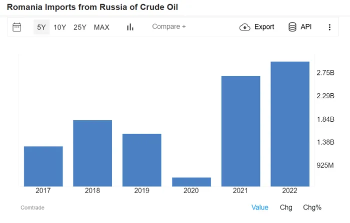 Importurile României din Rusia de țiței au fost de 2,99 miliarde USD în 2022, conform bazei de date COMTRADE a Națiunilor Unite privind comerțul internațional.