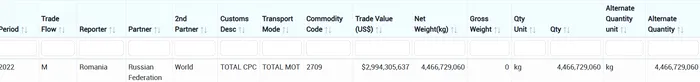 Captură foto: comtradeplus.un.org / Cantitatea de țiței importată de România din Rusia (2022)