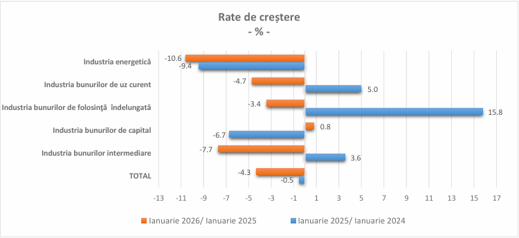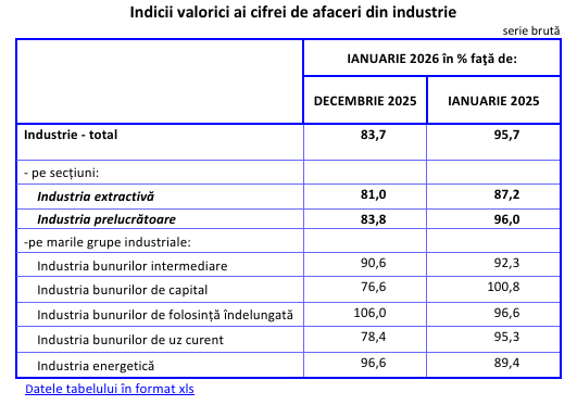 Cifra de afaceri din industrie a scăzut, în termeni nominali, în luna ianuarie 2026 faţă de aceeași lună din anul precedent, pe ansamblu, cu 4,3%, ca urmare a scăderii înregistrate în industria extractivă, -12,8%, și în industria prelucrătoare, -4,0%. Pe marile grupe industriale, scăderi au înregistrat industria energetică, -10,6%, industria bunurilor intermediare, -7,7%, industria bunurilor de uz curent, -4,7% și industria bunurilor de folosință îndelungată, -3,4%. Industria bunurilor de capital a crescut cu 0,8%.