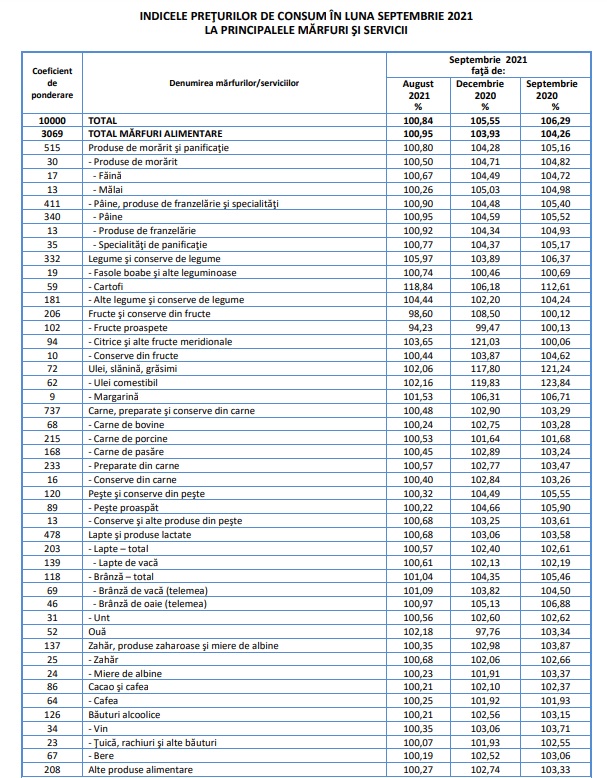 Potrivit INS, rata medie a preţurilor de consum în ultimele 12 luni (octombrie 2020 – septembrie 2021) faţă de precedentele 12 luni (octombrie 2019 – septembrie 2020) este 3,6%.