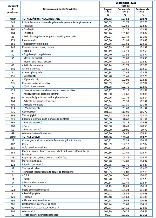 Pe categorii de mărfuri și servicii, cele mai mari scumpiri au fost la energie. Astfel, prețurile la energia electrică au crescut, în septembrie 2021 față de septembrie 2020, cu 24,65%, iar la gaze, cu 21,51%, apoi combustibili, cu 16,7%Singura scădere de preț a fost la energia termică, cu 0,21%. La mărfurile alimentare, cele mai mari majorări de prețuri au fost la cateorie ulei, slănină, grăsimi, cu 21,24%.