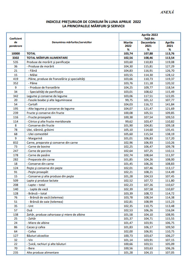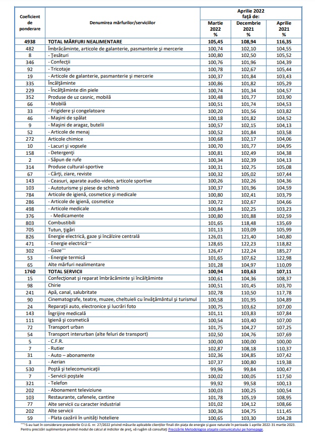 Cele mai mari creșteri ale prețurilor de consum au fost, în aprilie 2022, față de aprilie 2021, la marfuri alimentare, de 13,54% (în creștere de la 11,2% din martie), urmate de mărfuri nealimentare, de 16,35% față de 11,86% în martie) și servicii, de 7,11% (față de 6,53% în martie).