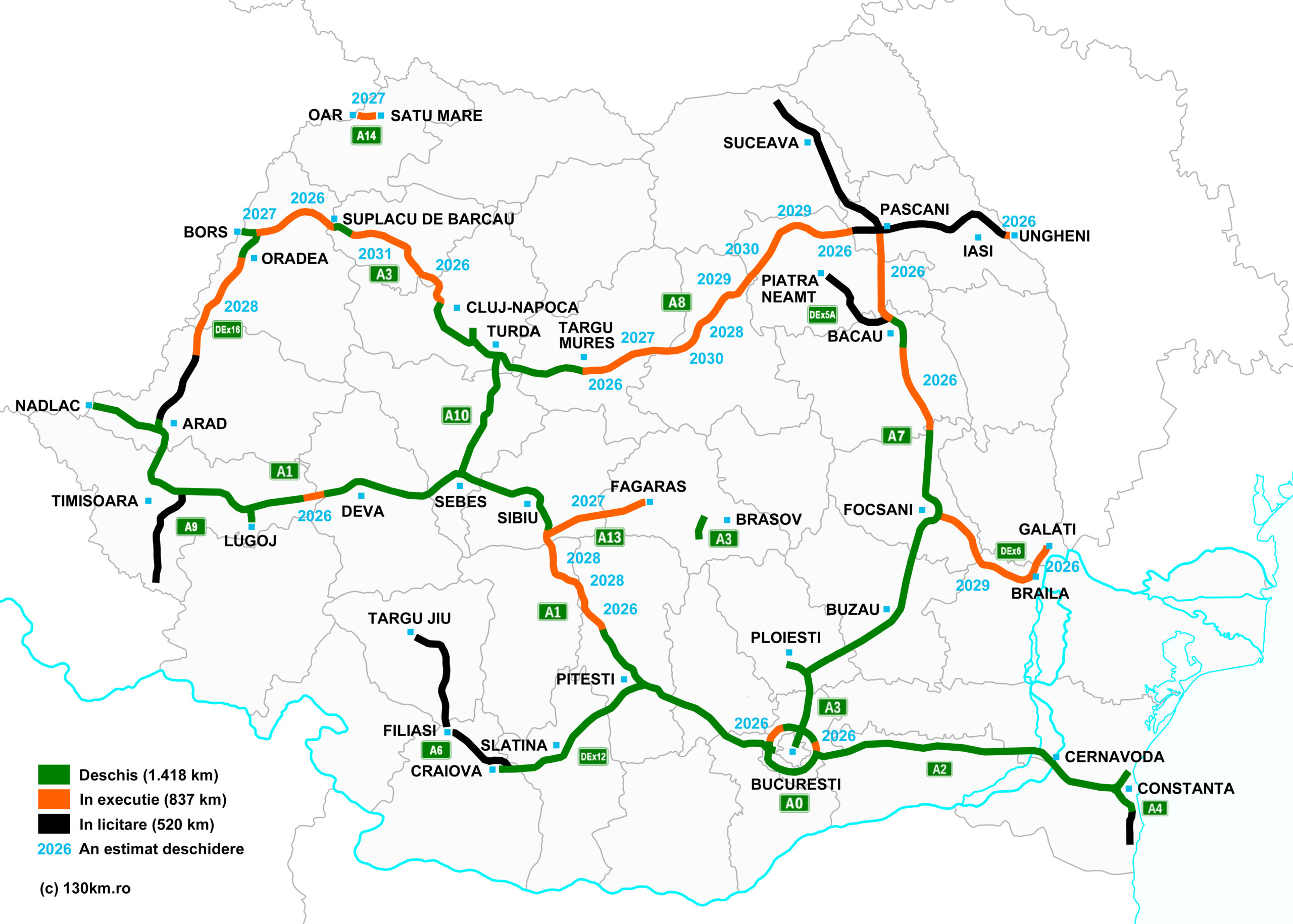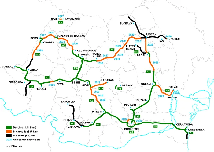 „Rețeaua de autostrăzi și drumuri expres a ajuns la 1416,3 kilometri aflați în exploatare la care adăugăm 840,7 contractați pentru (proiectare și) execuție și încă 486,2 aflați în licitație de lucrări. După recordul absolut din mega-electoralul an 2024, aproape 195 kilometri deschiși, și 146 km în 2025, în acest an sunt șanse foarte mari să batem iar recordul: 244 de km de autostradă și drum expres care vor fi dați în trafic, realist-optimist, în sine o premieră în previziunile noastre. În scenariul ultra-optimist, mai adăugăm încă 28,5 (pe A3) plus 11 (pe A8), deci un total posibil de aproximativ 284 km”, a transmis asociația.