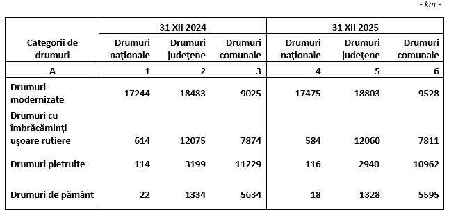 „La 31.12.2025, lungimea rețelei de drumuri publice totaliza 87220 km, din care 18193 km (20,8%) drumuri naţionale, 35131 km (40,3%) drumuri judeţene şi 33896 km (38,9%), drumuri comunale.”, arată datele INS.