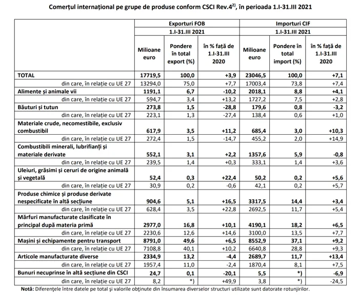 Potrivit datelor INS, în primele trei luni, ponderi importante în structura exporturilor şi importurilor sunt deţinute de grupele de produse: maşini şi echipamente de transport, respectiv 49,6% la export şi 37,1% la import, şi alte produse manufacturate, respectiv 30,0% la export şi 29,9% la import.