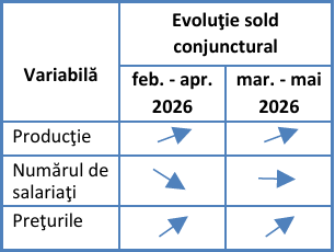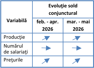 În industria prelucrătoare, rezultatele anchetei desfășurate în luna martie indică, pentru următoarele trei luni, creștere moderată a volumului producției, reflectată printr-un sold conjunctural de +6%. În ceea ce privește numărul de salariați, se estimează relativă stabilitate, soldul conjunctural fiind de -5%. În același timp, prețurile produselor industriale sunt așteptate să crească, tendință indicată printr-un sold conjunctural de +34%.