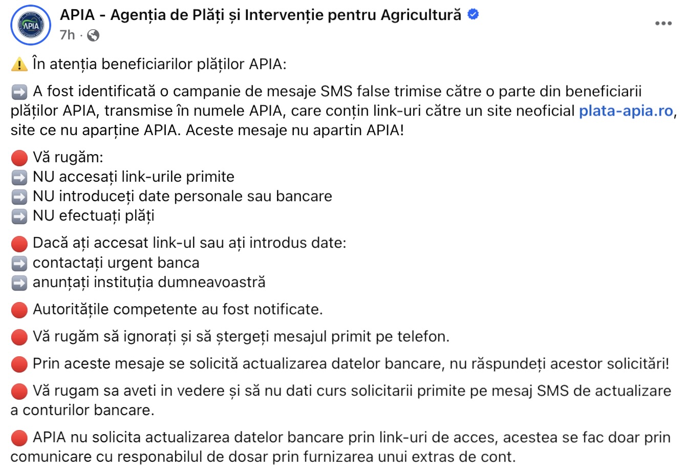 În paralel, autoritățile au identificat o campanie de mesaje SMS frauduloase, trimise direct beneficiarilor de plăți. Acestea conțin link-uri către site-ul neoficial plata-apia.ro, care nu are nicio legătură cu APIA.