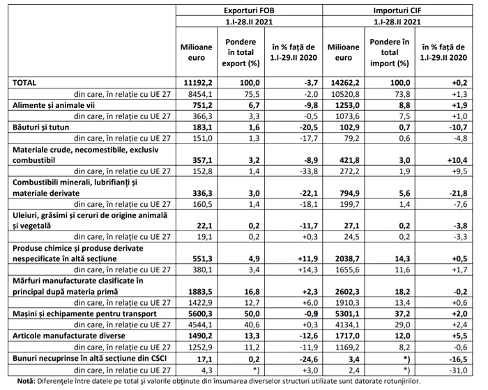 În cifre absolute, valoarea exporturilor la această categorie a scăzut cu 52 de milioane de euro, respectiv de la 5,652 miliarde de euro în primele două luni din 2020, la 5,600 miliarde de euro în primele două luni din 2021. În același timp, valoarea importurilor a crescut cu aproape 100 de milioane de euro, de la 5,202 miliarde de euro, la 5,301 miliarde de euro.