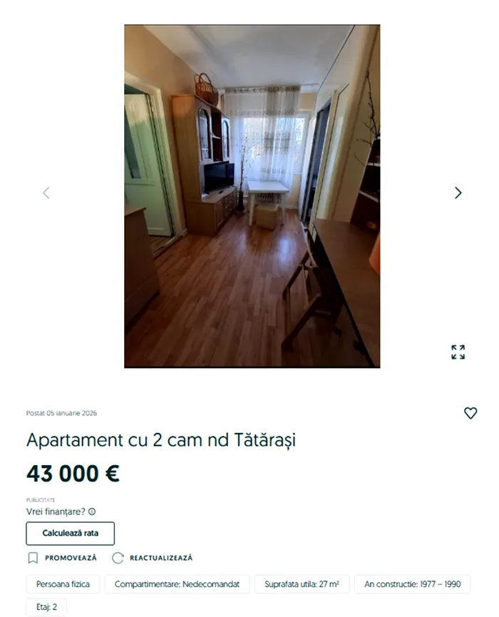 Cel mai ieftin apartament cu două camere din Iași costă doar 43.000 de euro. Este vorba de o locuință nedecomandată, cu suprafață utilă de 27 metri pătrați, ani construcție după 1977, situată la etajul 2 al unui bloc.