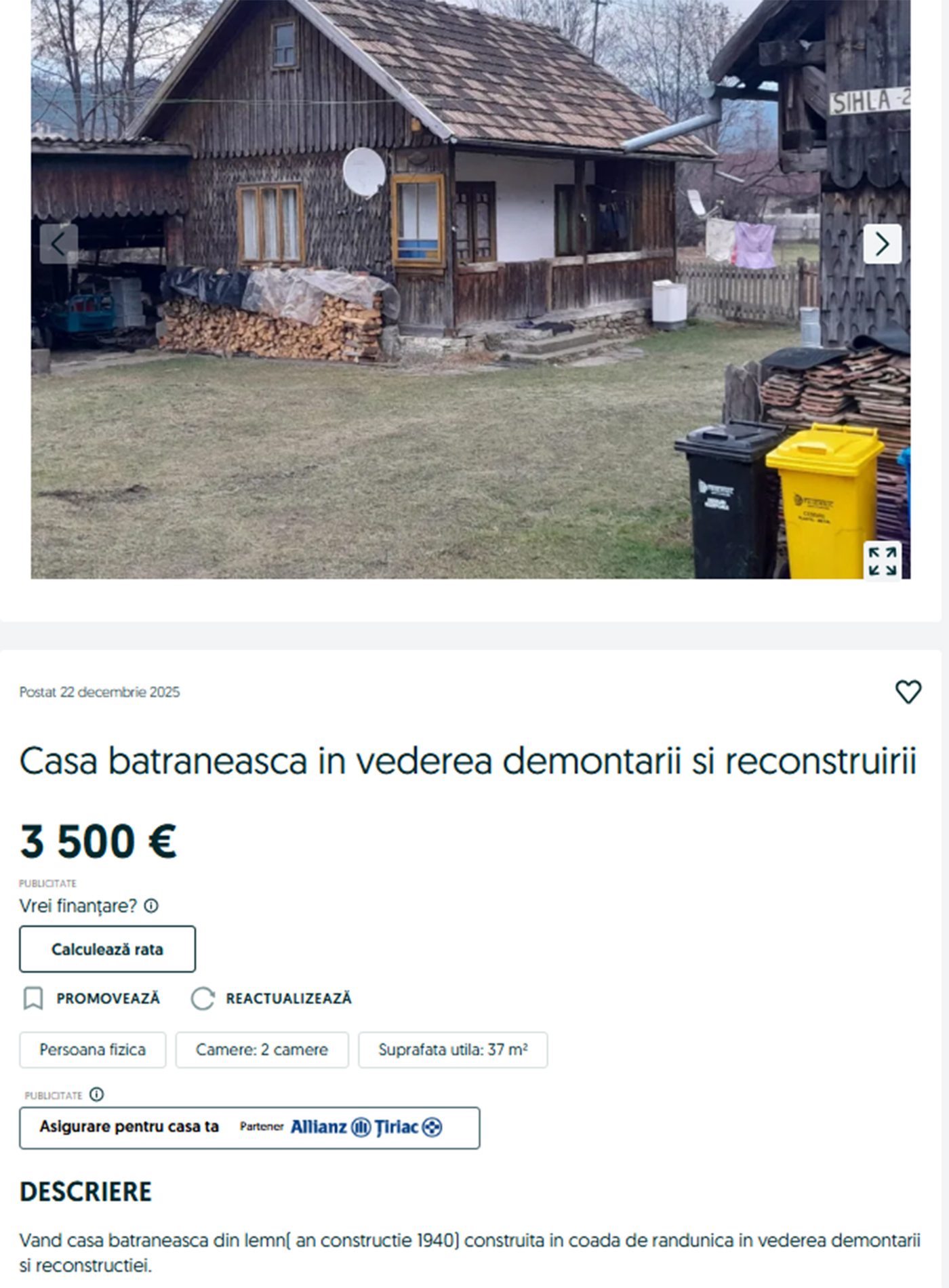 „Vând casa bătrânească din lemn (an construcție 1940) construită în coadă de randunică în vederea demontarii și reconstrucției. Atentie! Nu se vinde terenul!”, se arată în anunțul publicat pe platforma OLX.