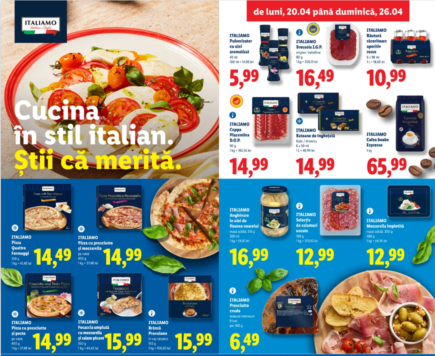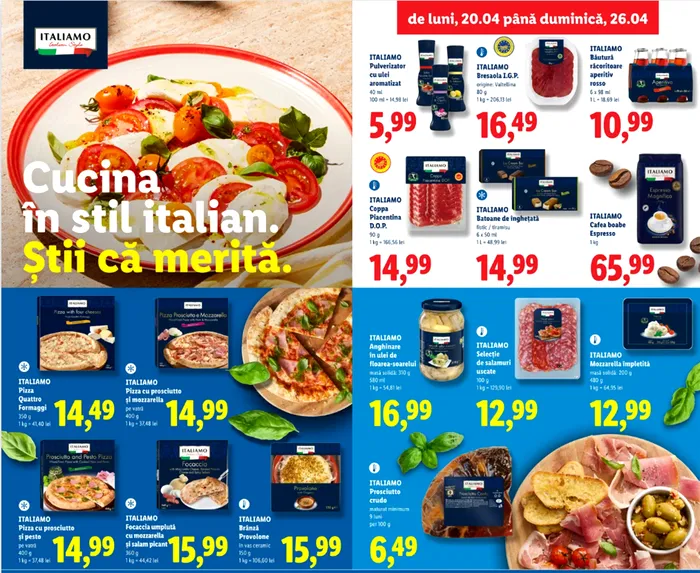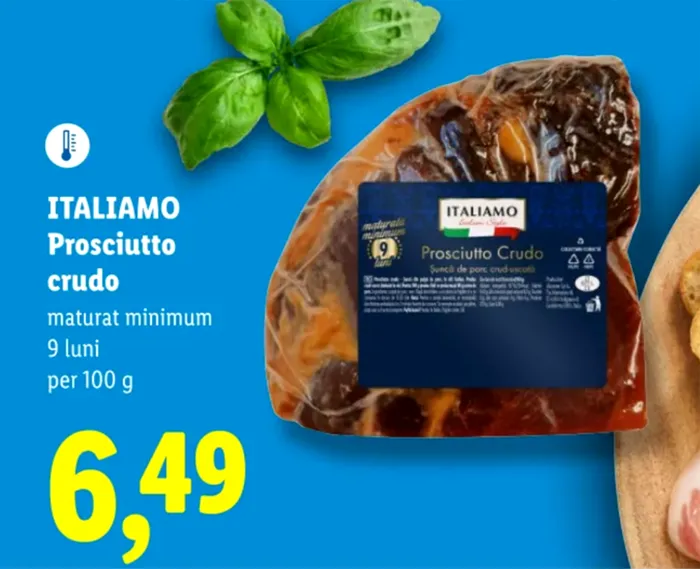 Este vorba despre prosciutto crudo care poate fi cumpărată în intervalul 20 – 26 aprilie, la prețul redus de 6,49 lei/100 de grame. Fiind săptămâna italiană, magazinul introduce temporar produse specifice acestei țări, iar prosciutto crudo este unul dintre acestea.