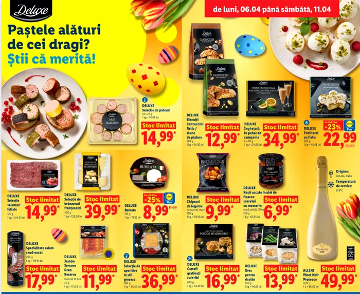 Pentru ca sărbătorile de Paști să fie complete, mai puteți completa masa cu delicatese precum salamuri feliate (14,99 lei), brânzeturi franțuzești (39,99 lei) și un Pinot Noir Prosecco 1 L ALLINI, la 49,99 lei.