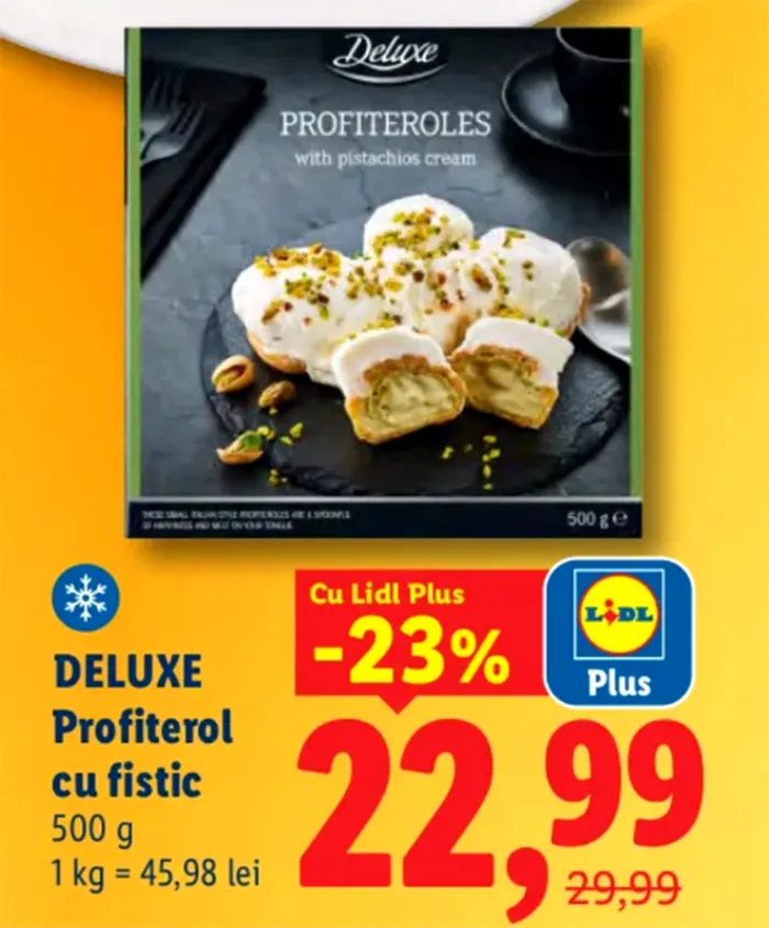 Este vorba de profiterolul cu fistic DELUXE, 500 grame, care beneficiază de o reducere de 23%.