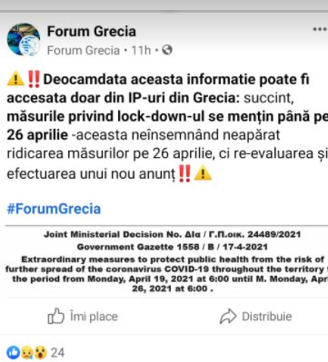 Turiștii români care merg în Grecia vor fi supuși, în continuare, restricțiilor privind lockdown-ul. Reprezentanții grupului Forum Grecia au transmis, sâmbătă, că restricțiile din carantină sunt menținute până în 26 aprilie, urmând ca după această dată să fie anunțate noi măsuri, fără ca asta să însemne obligatoriu ridicarea lockdown-ului.