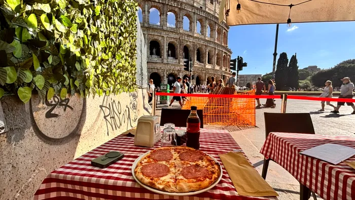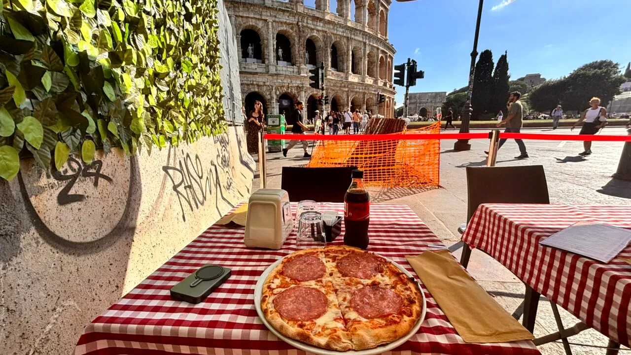 Astfel, turistul român și-a comandat o pizza cu salam și o sticlă de Coca-Cola, cu vedere la Colosseumul din Roma.
