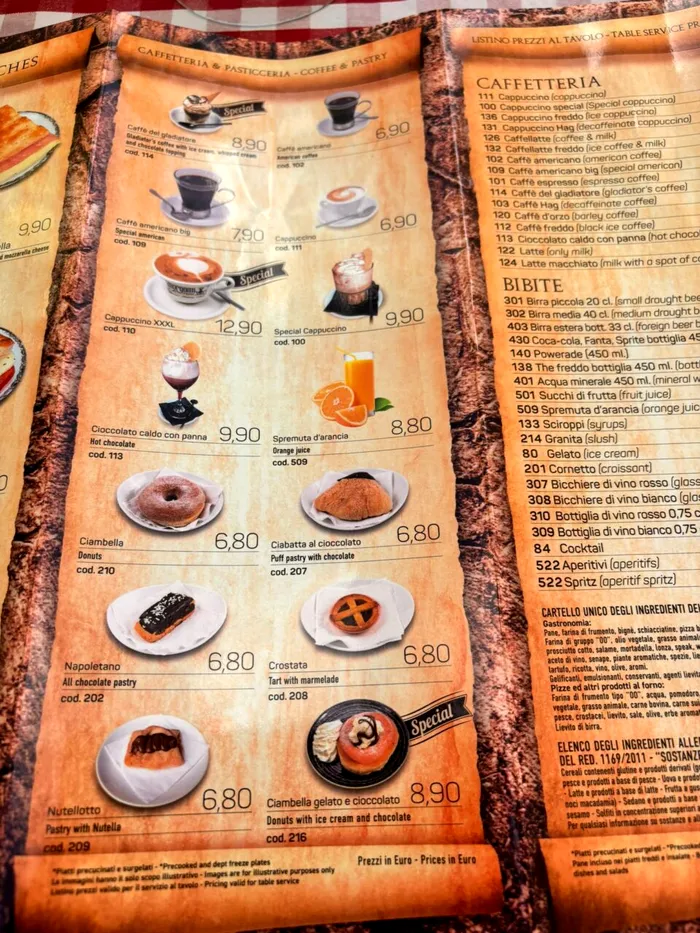 Una dintre specialitățile restaurantului, o cafea de gladiator, costă 8,90 de euro, în timp ce un Cappuccino XXXL este 12,90 de euro.