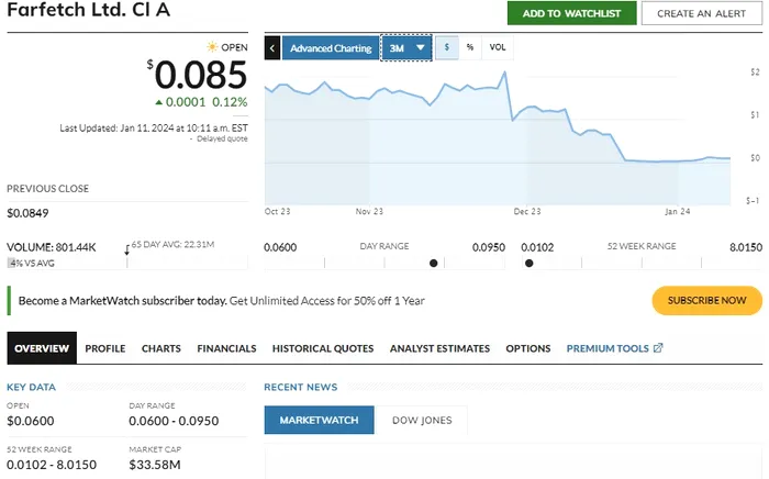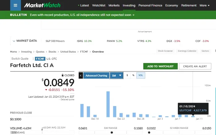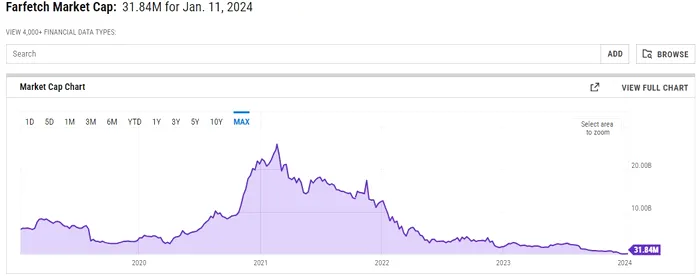 Astfel, la ora publicării, capitalizarea Farfetch Limited a ajuns la 33,58 milioane de dolari. Este o valoare de piață de aproape 780 de ori mai mică față de vârful afacerii, de 26,02 de miliarde de dolari, atins pe 19 februarie 2021.