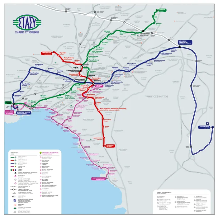Dacă rețeaua „Metrorex” a Bucureștiului are cinci linii de metrou (plus alte două în pregătire), metroul din Atena trei linii. Stațiile sunt strategic amplasate în toată capitala Greciei, zeci de cartiere fiind deservite de rețea.