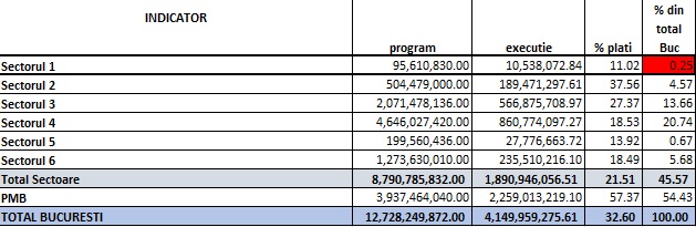 Sintetizând, gradul de realizare a cheltuielilor din fonduri europene de către municipalitatea București și cele șase sectoare arată astfel: