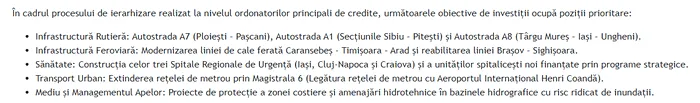 În zona infrastructurii rutiere, printre proiectele aflate în topul priorităților se regăsesc autostrăzile A7, A1 și A8, considerate investiții esențiale pentru conectivitatea regională și pentru fluidizarea transportului de mărfuri și persoane. De asemenea, în infrastructura ferioviară sunt prioritarea modernizarea liniei Caransebeș-Timișoara-Arad și reabilitarea linei Brașov-Sighișoara. Sectorul sănătății rămâne un pilon important al investițiilor publice iar proiectele pun accentul pe construcția Spitalelor Regionale de Urgență din Iași, Cluj-Napoca și Craiova, alături de alte unități spitalicești noi finanțate prin programe strategice.