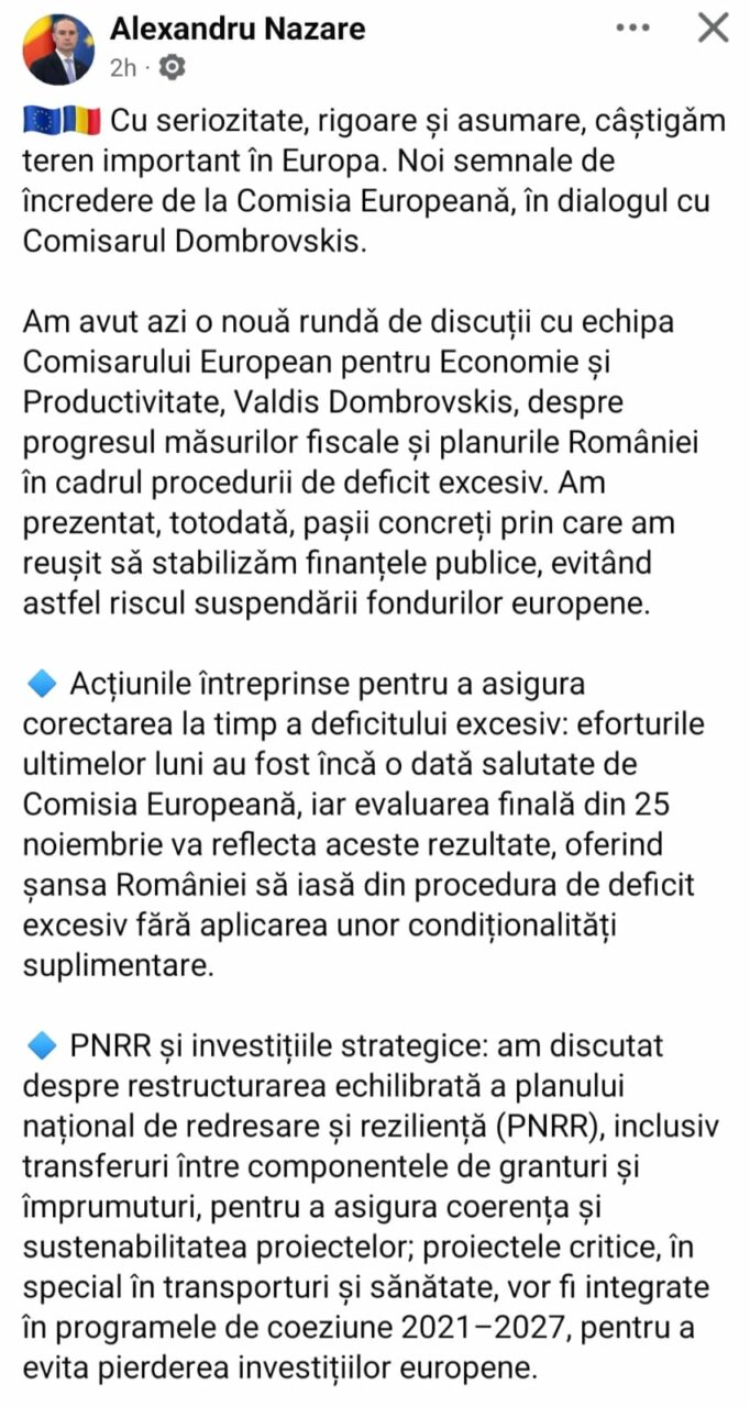 După dialogul dintre Dombrovskis și premierul Bolojan, a venit rândul minstrului Nazare să vorbească despre discutiile purtate astăzi cu ecipa comisarului european pentru Economie și Productivitate. Acesta spune într-o postare pe pagina personală de Facebook că a vorbit despre progresul măsurilor fiscale și despre planurile României în cadrul procedurii de deficit excesiv.