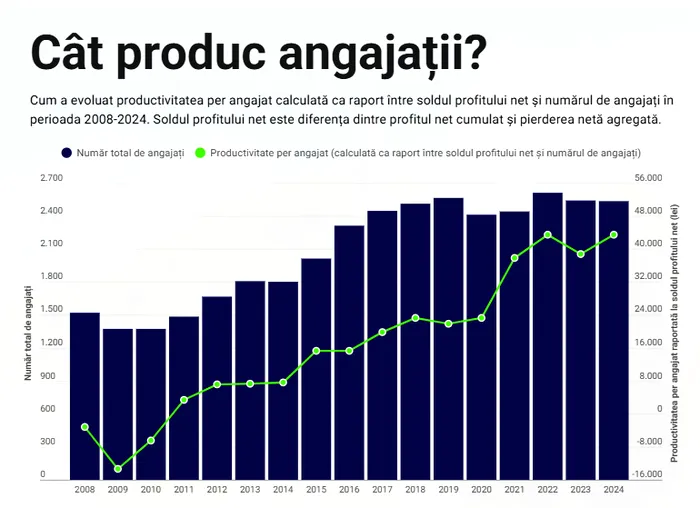 Când vine vorba de numărul total de angajați al companiilor înregistrate în orașul „miracol” din România, acesta a cunoscut o creștere de 67% în perioada analizată. În 2008, în Râșnov erau angajați aproximativ 1.519 oameni, iar în 2024 erau angajați aproximativ 2.533. De asemenea, productivitatea angajaților calculată ca raport între soldul profitului net și numărul de angajați a trecut de la o pierdere de aproximativ 3.100 de lei per angajat la un profit net de aproape 43.500 de lei per angajat.