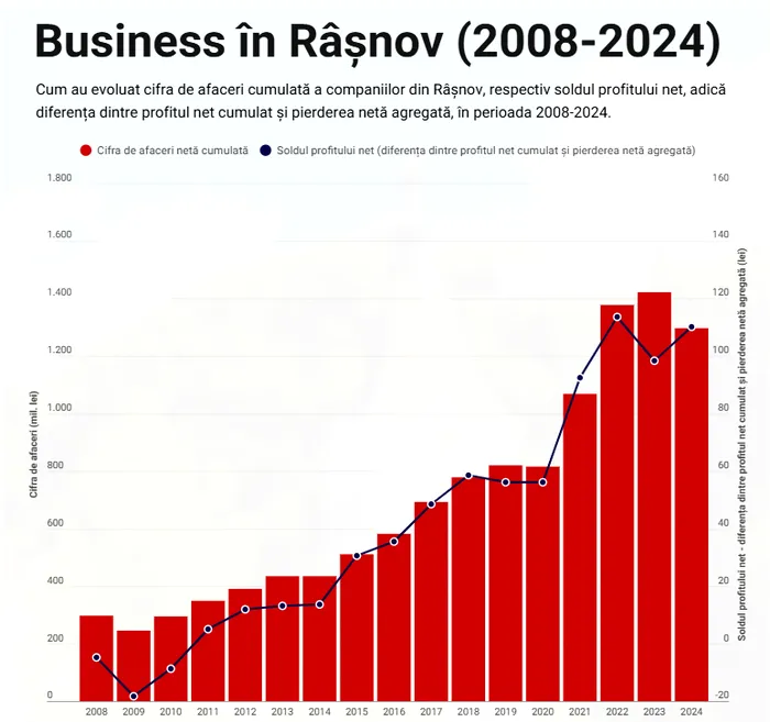 Profiturile nete cumulate ale companiilor înregistrate în orașul din județul Brașov au crescut de peste 19 ori într-o perioadă de doar 17 ani. La nivel local, cei mai mari jucători sunt companiile cu capital străin active în producție care în 2024 au înregistrat o cifră de afaceri netă cumulată de 1,3 mld. lei, conform unei analize publicate de Termene.ro.