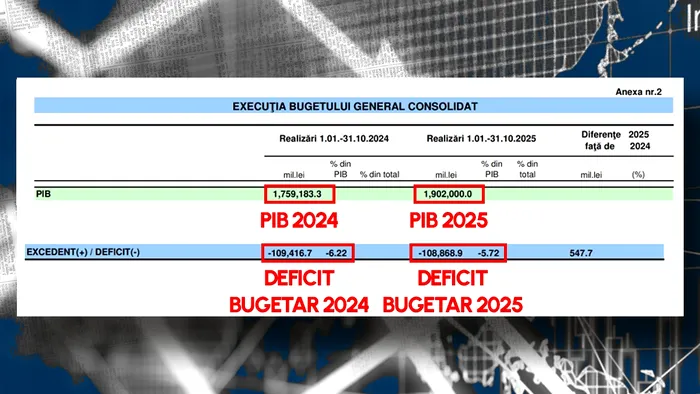 Deficitul bugetar a scăzut de la 6,2% din PIB în primele 10 luni din 2024 la 5,7% din PIB în aceeași perioadă din 2025, în aplauzele Comisiei Europene, care a suspendat procedura de deficit excesiv pentru statele membre UE, inclusiv pentru România.