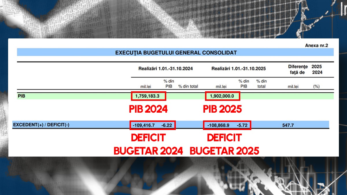 Cheia este la creșterea economică. Cele 109 mld. lei se raportează, în 2024, la un PIB de 1759 mld. lei. În 2025, cele 109 mld. lei se raportează la un PIB de 1.902 mld. lei. Așa se face că deficitul bugetar din primele 10 luni din 2024 era de 6,2% din PIB, iar în aceeași perioadă din 2025 era de 5,7% din PIB.