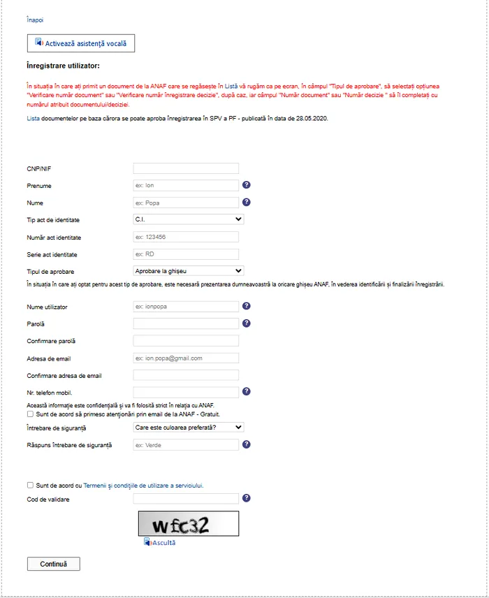 În ultima etapă, se va deschide un formular care necesită completarea cu datele personale, dar există posibilitatea ca numele de utilizator ales să fie deja înregistrat de altcineva, caz în care platforma va afișa o eroare și o sugestie de modificare. Dacă username-ul este în regulă, urmează ca ANAF să trimită un cod pe e-mail care trebuie introdus în platformă împreună cu un alt cod de securitate.