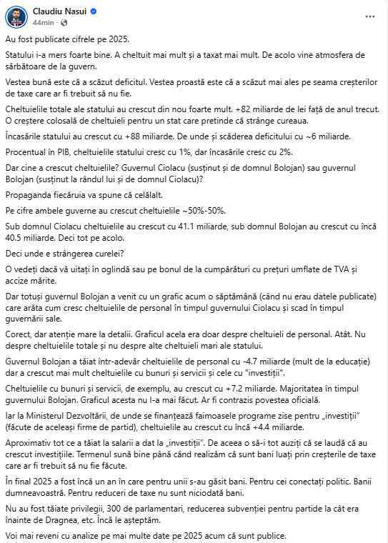 De asemenea, Năsui spune că în 2025, cheltuielile totale ale României au crescut cu 82 mld. lei, față de 2024. Creșterea este etichetată de acesta drept una „colosală”, mai ales în condițiile în care Guvernul Bolojan a susținut că țara noastră se confruntă cu un „dezastru economic” și a spus în repetate rânduri că avem nevoie de o politică fiscală dură. În același timp, încasările statului au crescut cu 88 mld. lei, ceea ce a dus la o scădere a deficitului bugetar cu aproximativ 6 mld. lei. Claudiu Năsui spune că, raportat la PIB, cheltuielile României au crescut cu 1%, în timp ce încasările au crescut cu 2%.