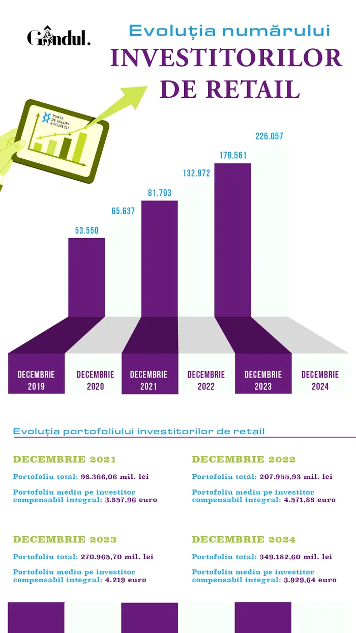 Puțin peste 50.000 de persoane, fizice și juridice, se încadrau, la finalul anului 2019, în categoria de investitori de retail, adică acei investitori individuali, nu cei profesionali, cum sunt, de exemplu, fondurile de investiții. De atunci și până în decembrie 2024, numărul lor a crescut de peste patru ori, conform datelor centralizate de Fondul de Compensare a Investitorilor. În ceea ce privește portofoliul, cifrele disponibile online arată o crește de peste 3 ori și jumătate în decurs de trei ani.