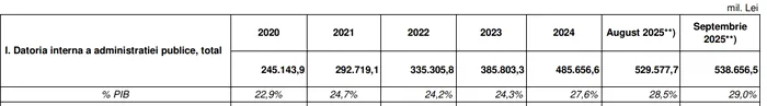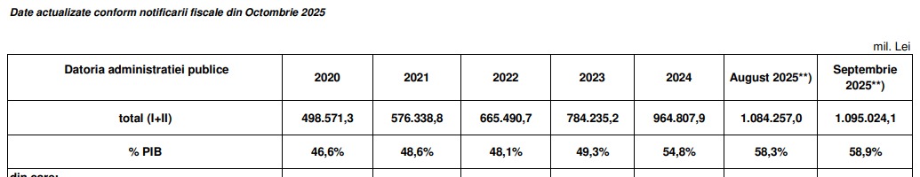 Datoria publică a României a ajuns la 1.095 mld. lei, adică 59% din PIB-ul de 1.860 mld. lei, estimat de guvern pentru anul 2025. Datele publicate de Ministerul de Finanțe arată că în primele 9 luni din 2025, cele mai recente cifre disponibile, guvernele Ciolacu, Predoiu și Bolojan au adăugat la datoria publică a țării nu mai puțin de 130 de miliarde de lei.