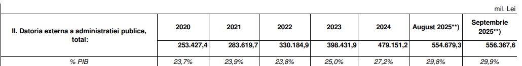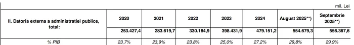 Astfel, povara publică a României a ajuns la peste 200 de miliarde de euro în 2025, pentru prima dată în istoria României. Datele de la Ministerul de Finanțe sunt valabile numai până în septembrie 2025, ceea ce înseamnă că, în mod cert, până la finalul anului datoria a mai crescut.