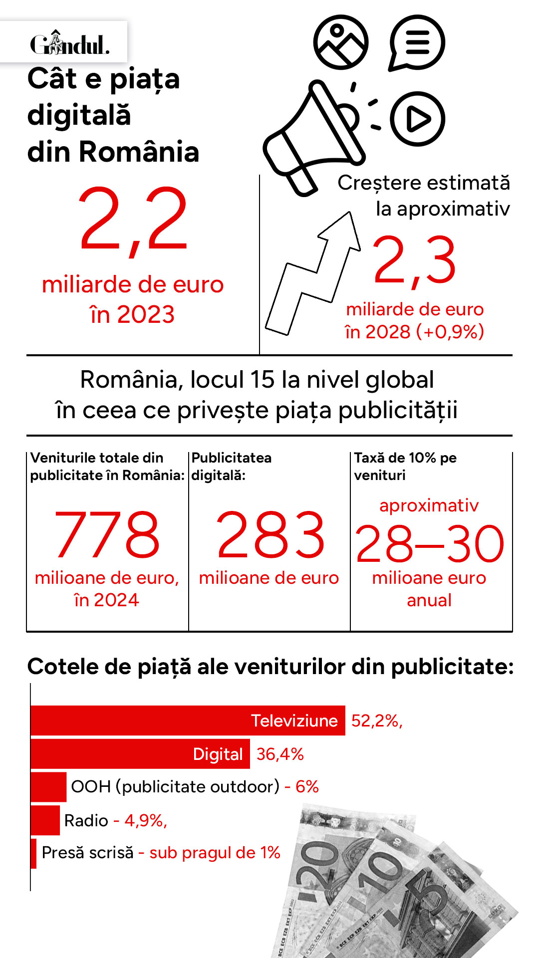 Având în vedere că piața totală a publicității a fost estimată la 2,2 miliarde de euro în 2023, segmentul digital însumează 800,8 milioane de euro anual.