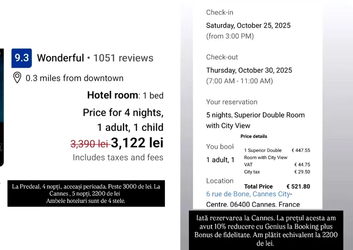 „Iată rezervarea la Cannes! La prețul acesta am avut 10% reducere, plus bonus de fidelitate. Am plătit echivalentul a 2.200 de lei”, a scris Oana Roman pe Instagram.