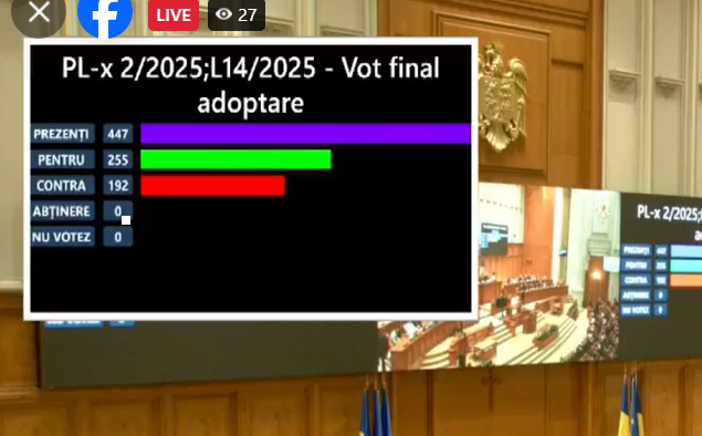 Parlamentul României a adoptat miercuri seara Legea Bugetului de Stat per 2025 și Legea Bugetului Asigurărilor Sociale per 2025. Au fost prezenți aproape 450 de parlamentari. Astfel, Legea Bugetului de Stat a fost adoptată cu 242 „pentru” și 184 „împotrivă”, iar Legea Bugetului Asigurărilor Sociale a trecut cu 255 „pentru”, 192 „contra”, din cei  447 de parlamentari prezenți.