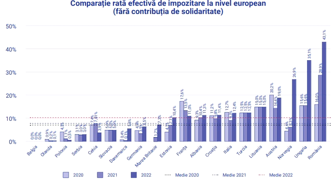 „Pentru România, în măsura includerii contribuției de solidaritate, rata efectivă de impozitare crește semnificativ, la 52,2%, prin urmare, având în vedere în mod coroborat analiza cu privire la cotele de impozitare aplicate de diferitele State Membre, este de așteptat ca rata efectivă de impozitare din România să rămână în continuare detașat cea mai ridicată, având în vedere toate celelalte state care au implementat cote de contribuție de solidaritate mai ridicate decât ale României sau egale cu ale României înregistrează rate efective de impozitare specifică (excluzând contribuția de solidaritate) foarte scăzute conform analizei noastre”, se arată în studiul citat.