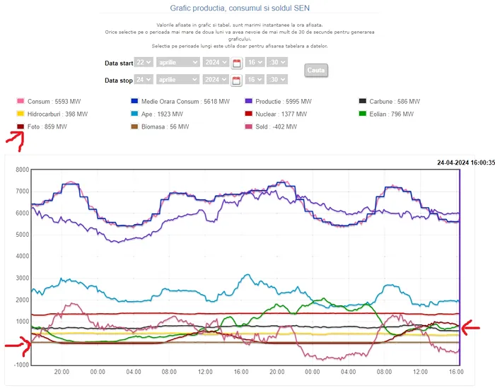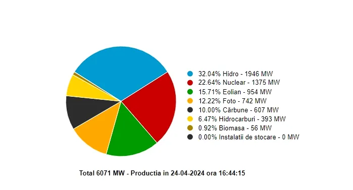 Cu 732 MW, energia din surse fotovoltaice reprezenta, miercuri după-amiază, 12% din producția totală la nivel național, de 6.076 MW.