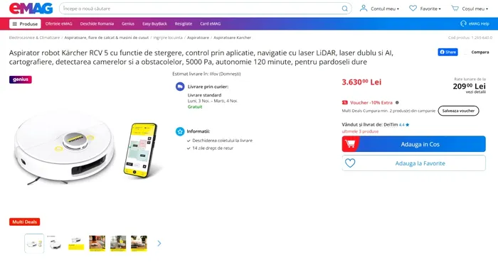 Modelul RCV 5, cu 5000 Pa, laser dublu, AI, funcție de cartografiere, detectarea camerelor și a obstacolelor, ideal de folosit pentru curățat pardoseli dure, costă 3.630 de lei pe același site.