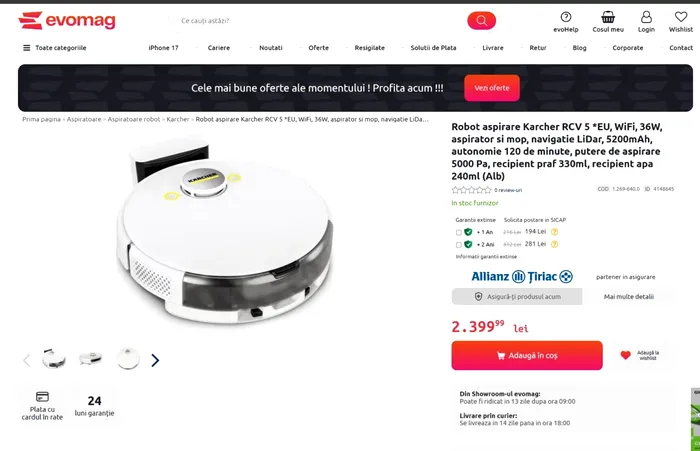 Pe Evomag, robotul de aspirare Karcher RCV 5 cu WiFi, 36 W, cu o baterie de 5.200 mAh, recipient praf 330 ml și cu un recipient pentru apă de 240 ml se vinde la 2.399,99 lei.