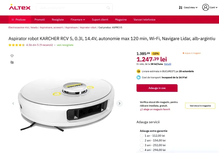 La un magazin Altex, un robotde aspirare de la Karcher, modelul RCV-5, costă 1.247,39 de lei. Caracteristicile sale: Funcții inteligente, mop, wi-fi, app, senzori, precum și filtru.